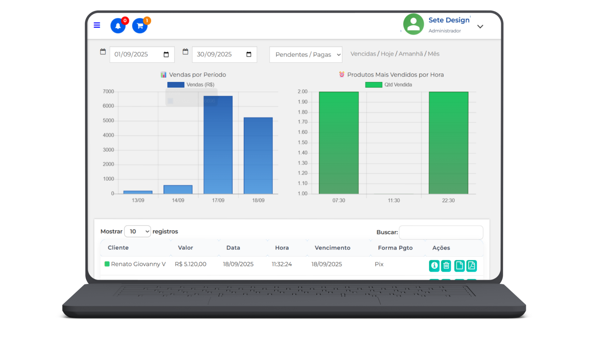 Indicadores de vendas, margem e performance por período.